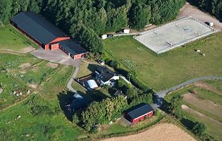 Ridhuset är sammanbyggt med stallet så ingen behöver gå utomhus för att komma in i ridhuset som har uppvärmt läktarrum och en sittläktare. Måtten är 22 x 50 meter.